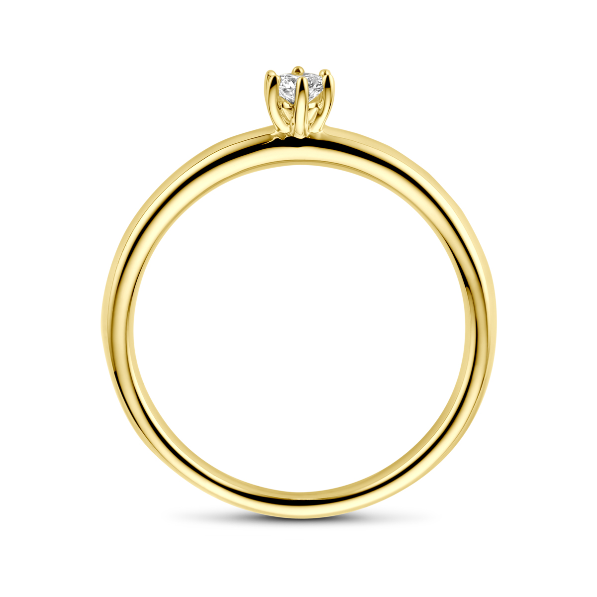 14k Geelgouden aanzoeksring uitgevoerd met diamant. De ring heeft een breedte van 4.5mm. De steenmaat is 3mm en het diamantgewicht is 0.10ct.