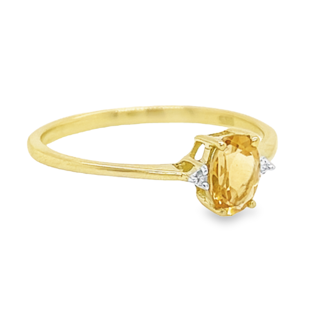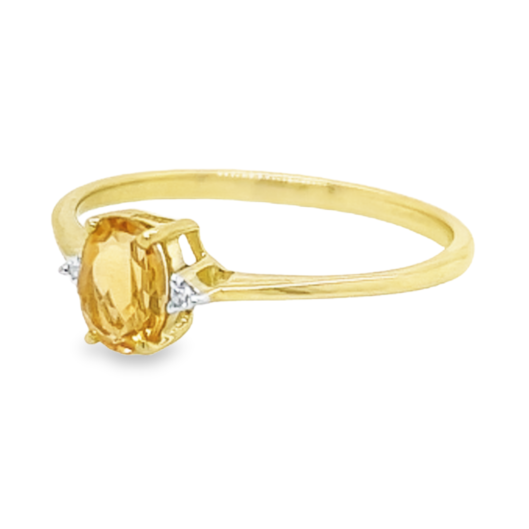 Deze 14-karaats geel gouden ring is ontzettend leuk. De kleurrijke steen is een echte citrien welke is gezet tussen vier gouden zetpoten. Naast de kleursteen zijn twee diamantjes gezet. Deze ring heeft een schitterende en kleurrijke uitstraling.