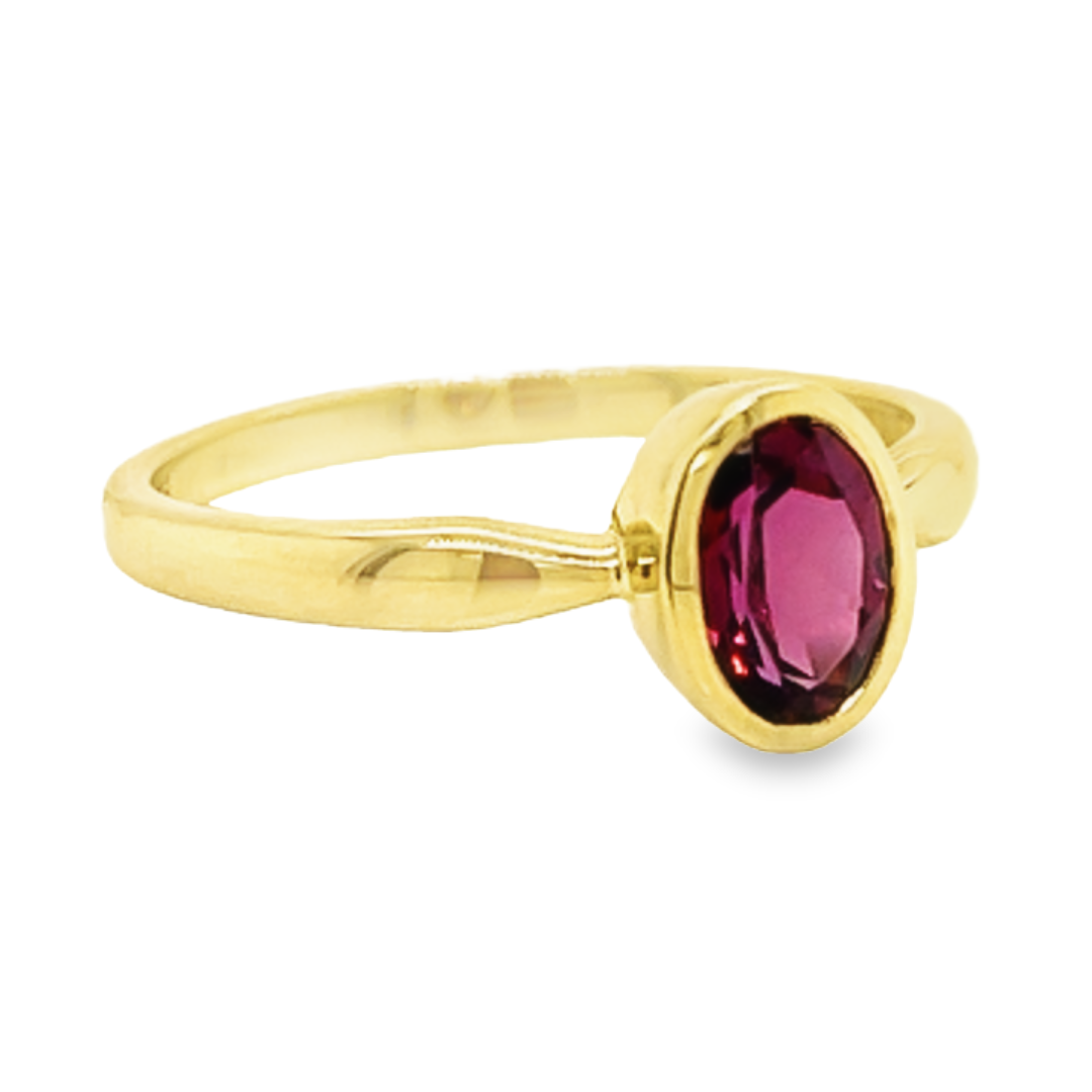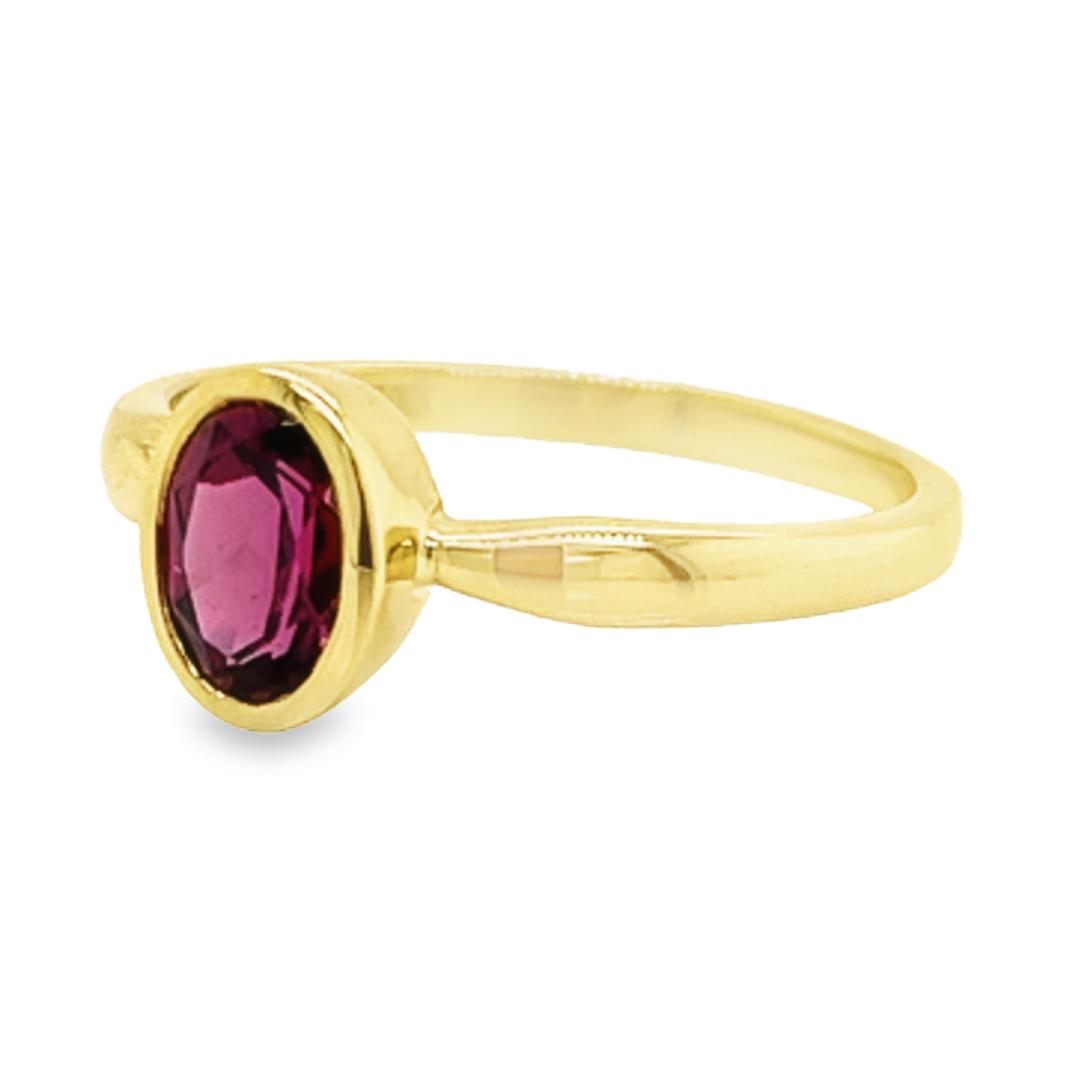 Deze geel gouden ring bevat een prachtige Rhodolite. De steen is ovaal geslepen en gezet in een ovale zetkast. Deze ring is ontzettend elegant en heeft mooie subtiele uitstraling.