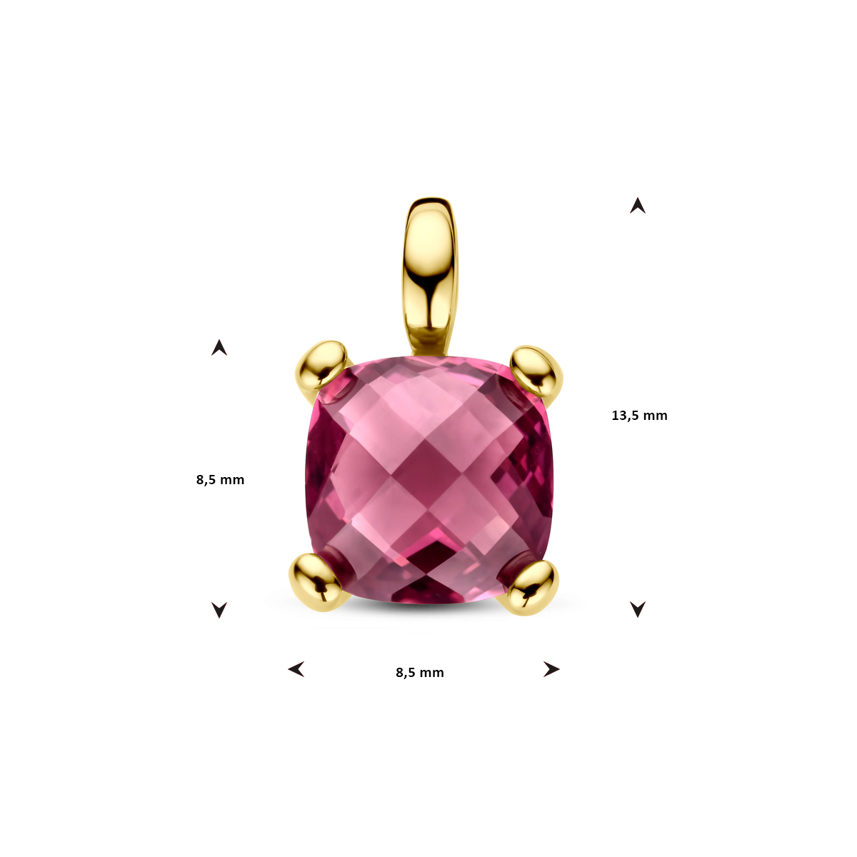 14k Geelgouden hanger uitgevoerd met roze rhodoliet. De hanger heeft een totale hoogte van 13.5mm.