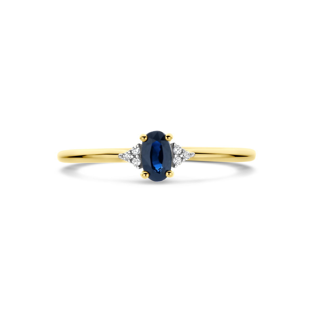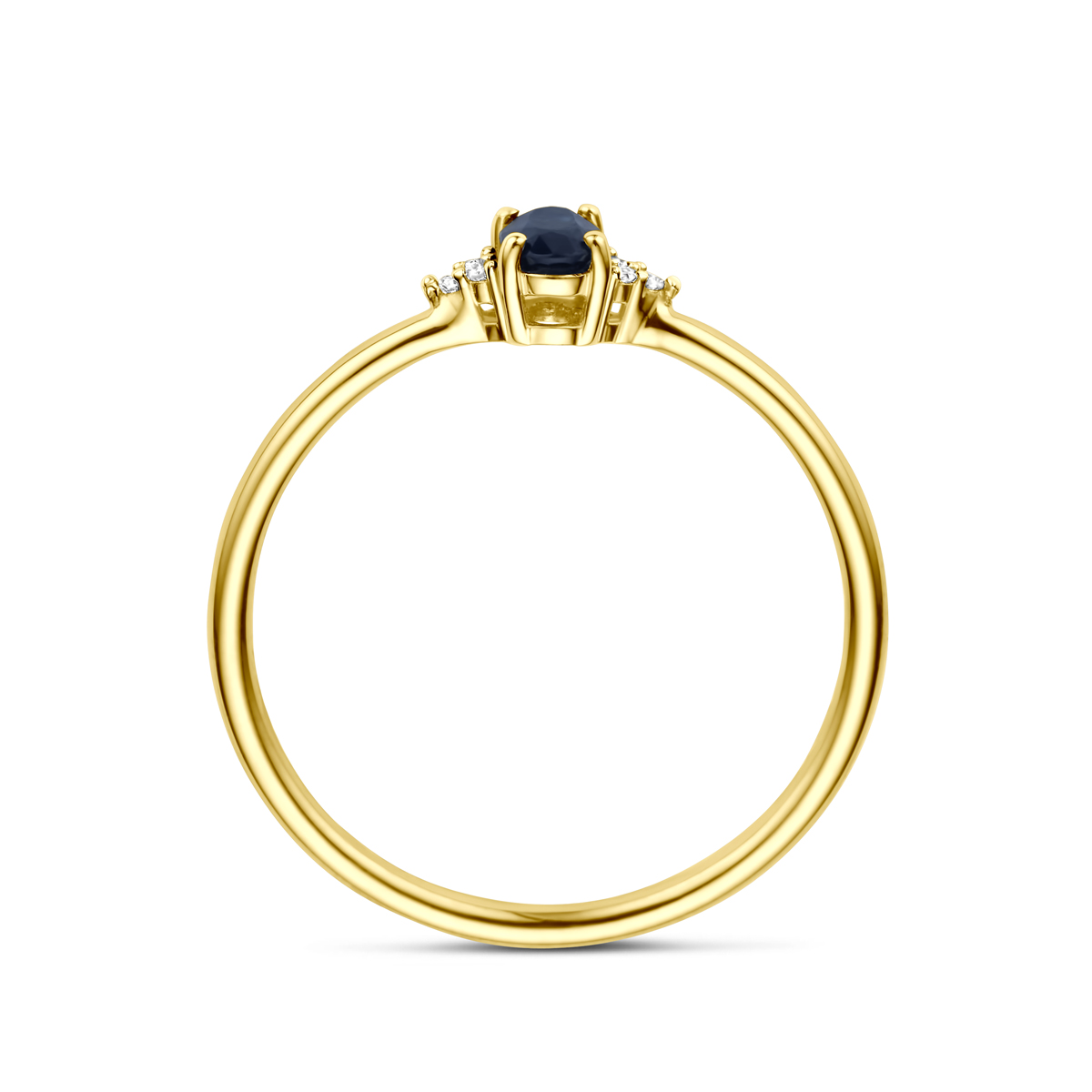 14k Geelgouden ring uitgevoerd met saffier en diamant. De ring heeft een afmeting van 5x3mm. Het totale diamantgewicht is 0.02ct.